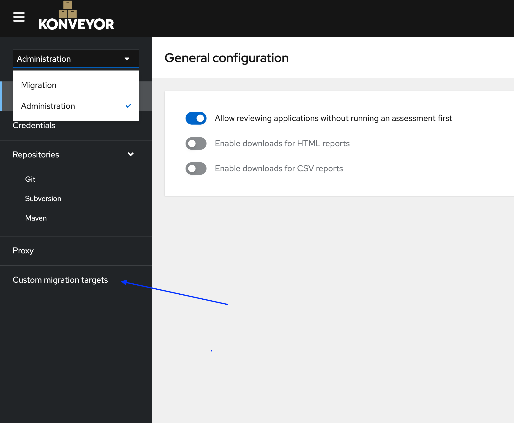 a. Open the Konveyor UI and Navigate to the ‘Administrator’ view