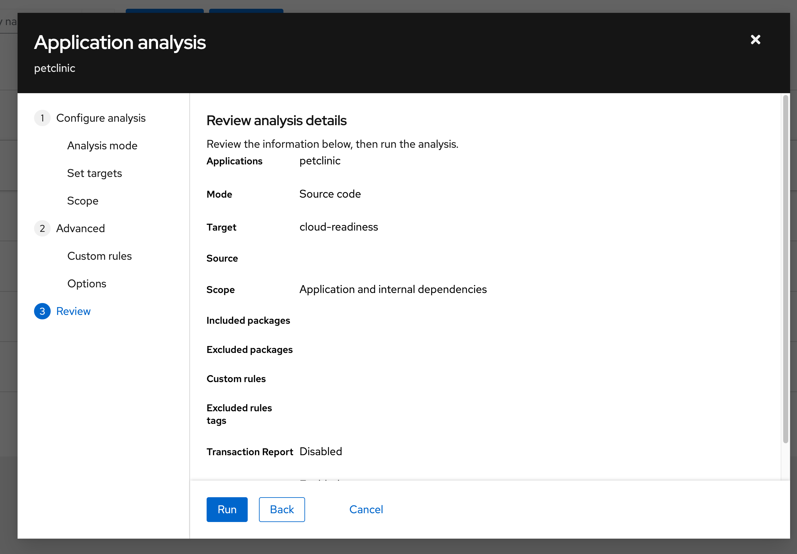 b. Select the petclinic app and click on the Analyze button.
